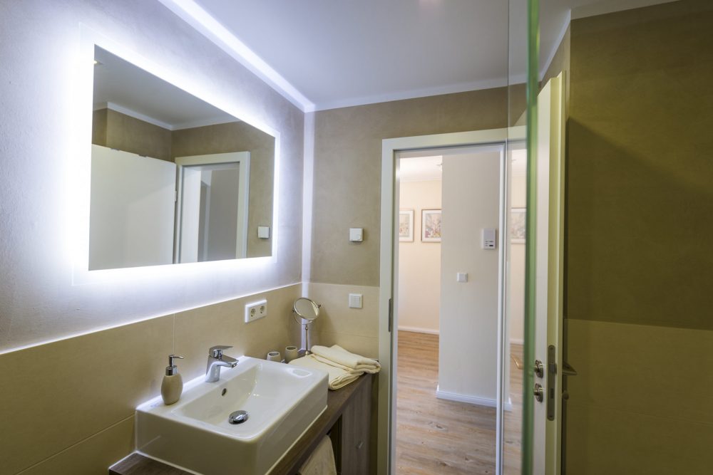 - bathroom with floor-level shower, mirror and hairdryer