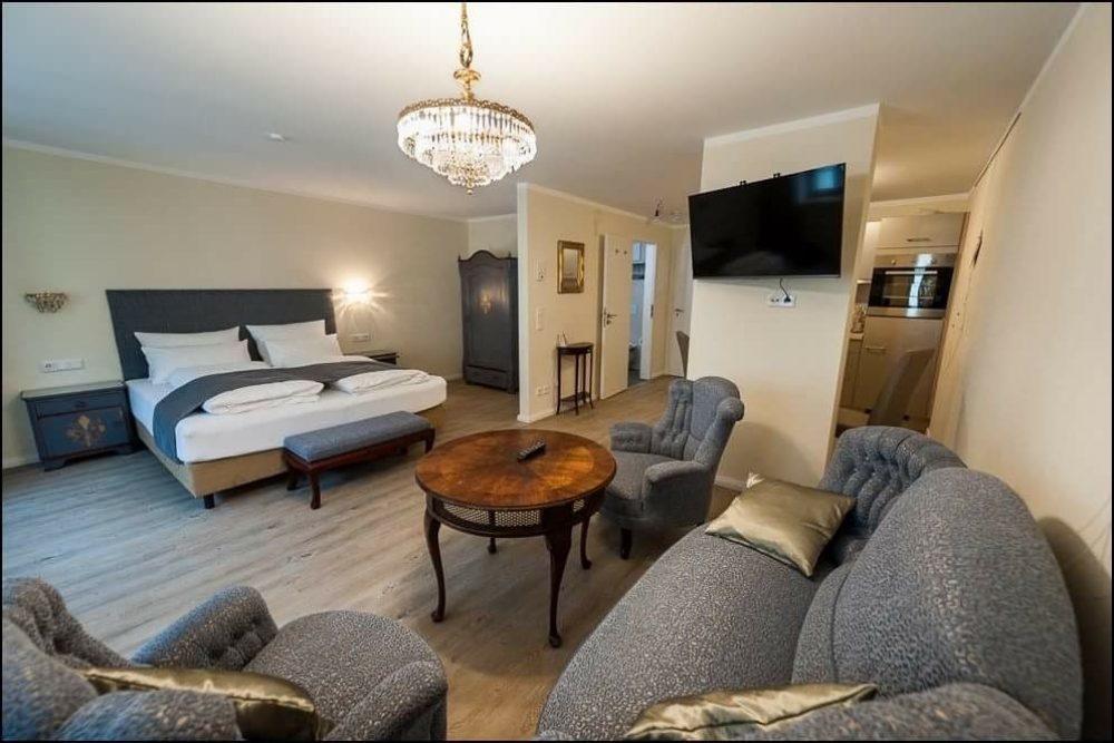 The apartment is located on the 2nd floor of the house. This combines the classic residential ensemble consisting of a sofa, Louis Philippe cabinet and crystal chandeliers from the Biedermeier period with modern comfort. The spacious kitchen with cooker, fridge freezer and dishwasher ensures particularly self-sufficient absolute independence.