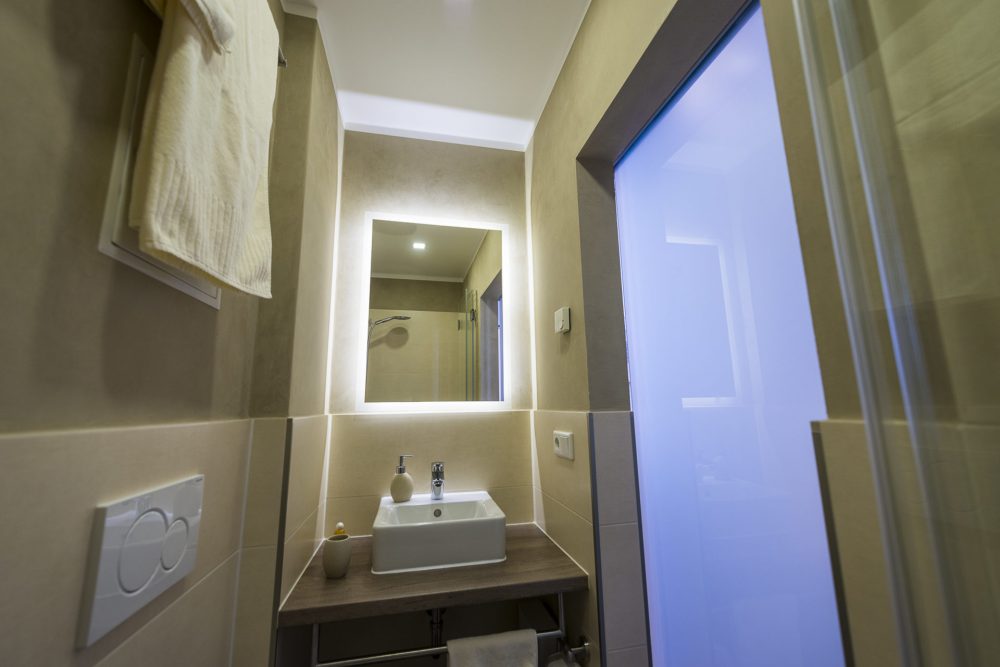 Bad with floor-level shower, toilet, mirror and hair dryer