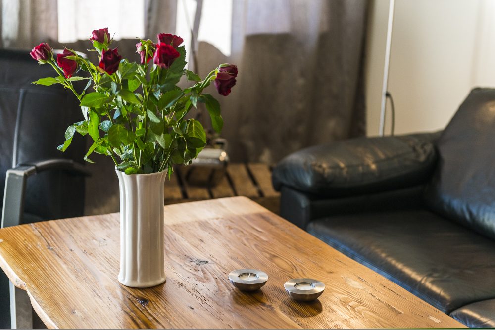 Dieses Appartement im 1. OG präsentiert sich im „Industriestyle“. Die sichtbaren Betondecken im Wohn-/ Schlafbereich wurden im Essbereich ergänzt durch ein gelungenes Arrangement aus „geretteten“ historischen Balken. Im Schlafbereich des Appartements gehen die überarbeiteten Reste der originalen „Brandmauer“ zum Nachbarhaus und das Mauerwerk der „Moderne“ des 21. Jh. eine interessante Symbiose ein. Das alte Küchenbuffet, Edelstahl- Küchengeräte und die schwarze Ledercouch im Wohnbereich runden das Bild ab. Der Balkon mit Blick in den begrünten Innenhof ist das „Fenster“ in die Gegenwart.