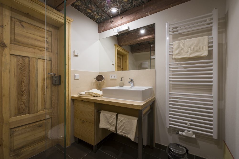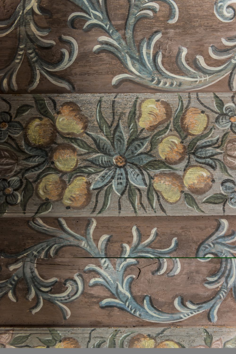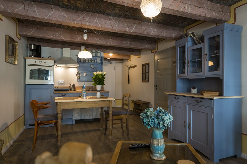 Das Appartement im 1. OG erwartet Sie mit der Attraktion des Hauses. Die mit Blumen- und Obstdekor bemalte Originalholzdecke aus der Zeit der Renaissance (16./17. Jh.) kombiniert mit einer rustikalen Küche im Biedermeierstil aus dem 19. Jh. und einem Hochbett im „Schlafgemach“, nachempfunden aus dem 19 Jh. lässt keine Wünsche offen für Liebhaber des althergebrachten „Lifestyles“.